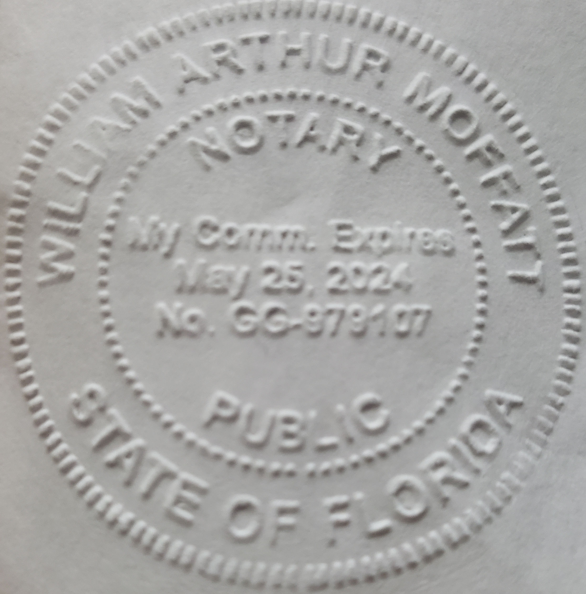 Embossed Notary stamp. While Florida no longer acknowledges the embossed Notary seal or "Impression Seal" by itself, Some local entities as well as many foreign ones may still require an embossed notary stamp along side the recognized rubber stamp. I do have an embossed stamp for such requirements. See picture.